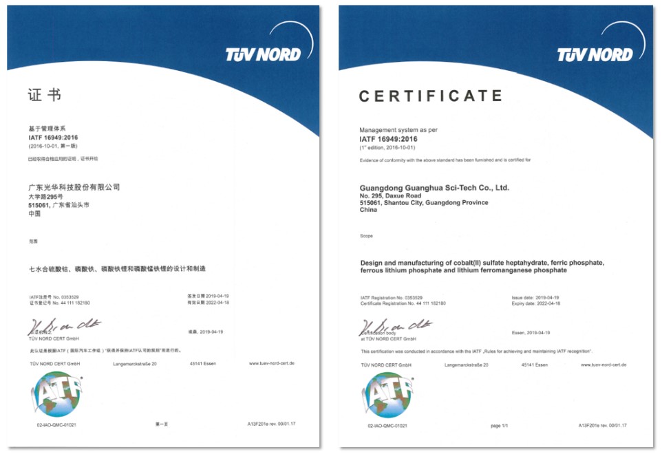 目前,經(jīng)過不懈努力,公司的七水合硫酸鈷、磷酸鐵、磷酸鐵鋰和磷酸錳鐵鋰近日順利通過了IATF16949:2016認(rèn)證,這意味著上述產(chǎn)品的設(shè)計及制造達(dá)到汽車行業(yè)質(zhì)量管理的先進(jìn)水平,產(chǎn)品品質(zhì)更加穩(wěn)定可靠。