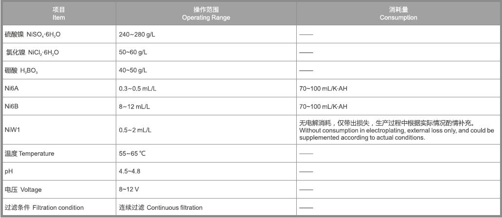 Ni6A:俗稱光亮劑,負責出光和填平。Ni6A不足時,鍍層光亮度下降,填平度不足;Ni6A過量時,低電流密度區發暗。嚴重過量時,鍍層脆性大,甚至造成漏鍍;
